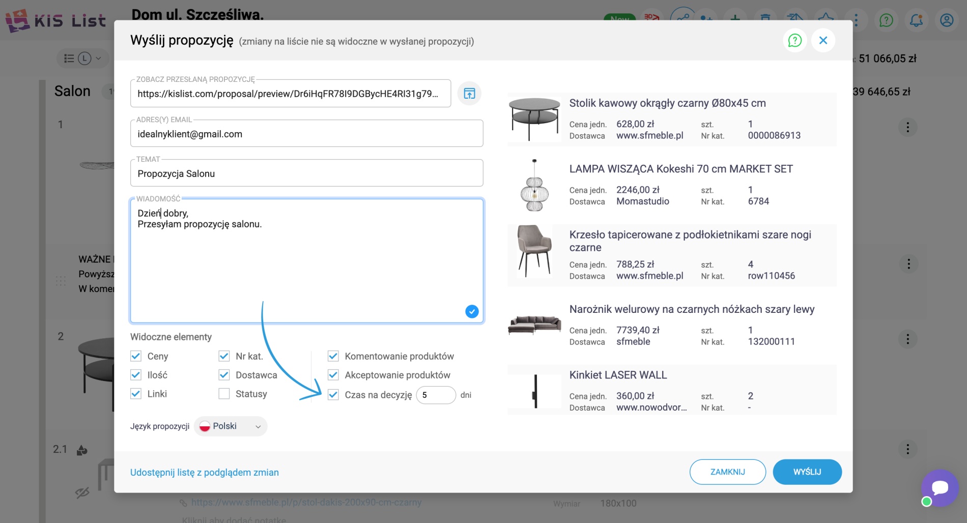 W KIS List, przesyłając klientowi propozycje, możesz ustalić czas na podjęcie decyzji. Jest to okres, w którym klient może akceptować lub odrzucać produkty umieszczone na przesłanej liście zakupowej.