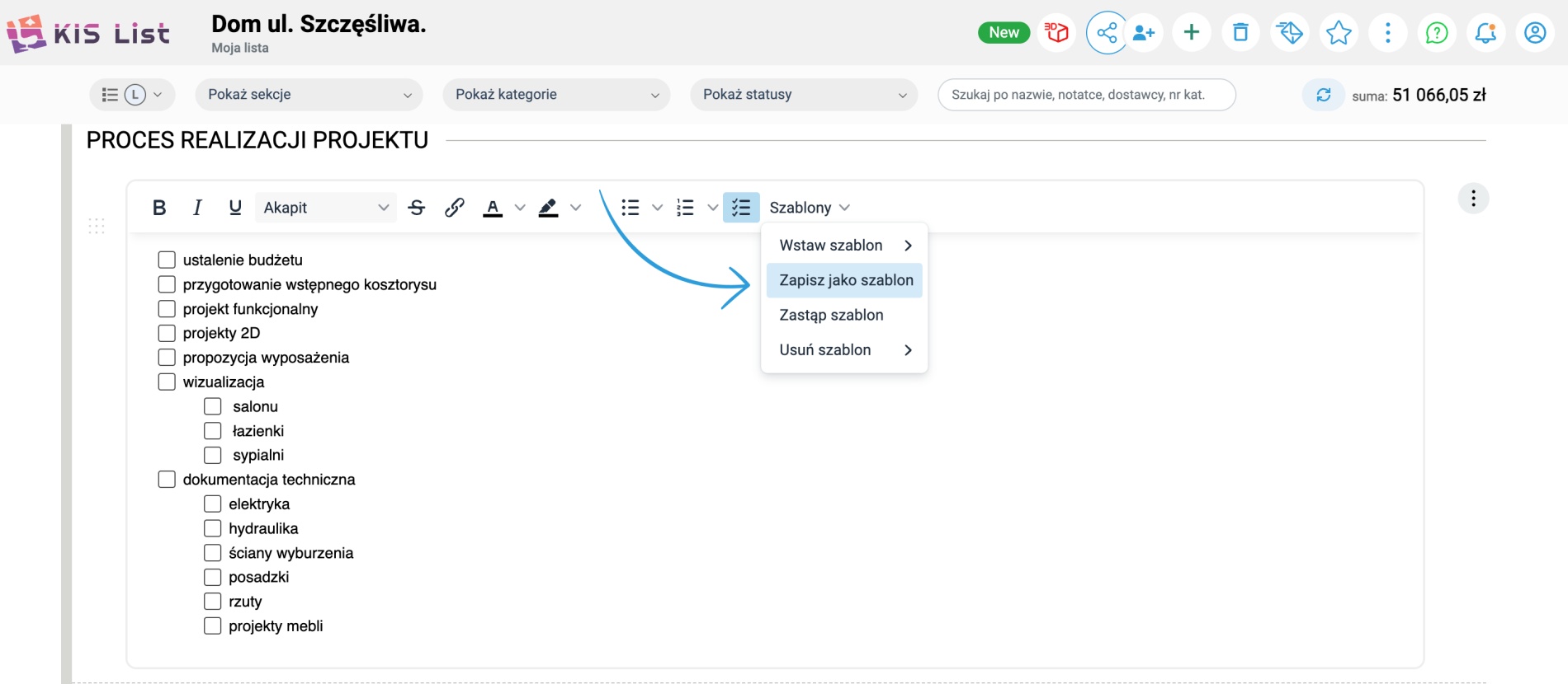 W KIS List możesz zapisać go jako szablon notatki i automatycznie dodawać do listy zakupowej przy konkretnym projekcie. Dzięki temu nie musisz więc tworzyć listy rzeczy do zrobienia za każdym razem od nowa i co najważniejsze usprawniasz swoją pracę.