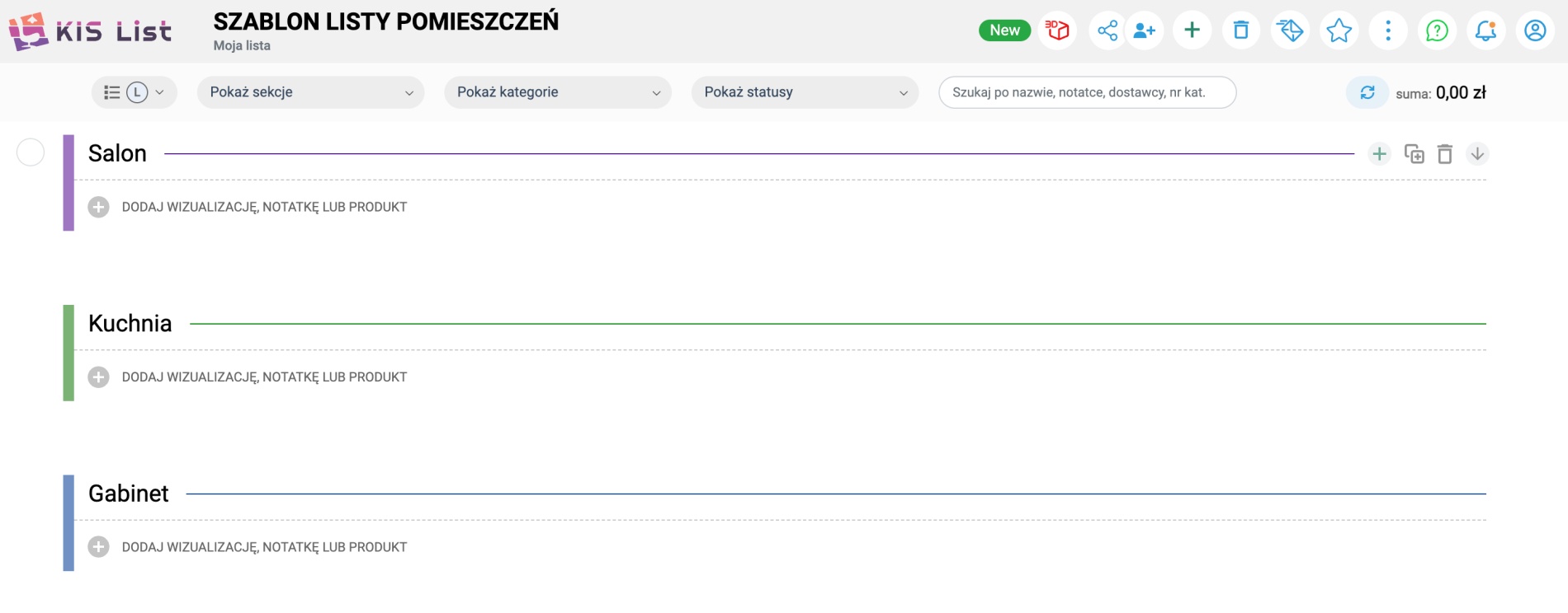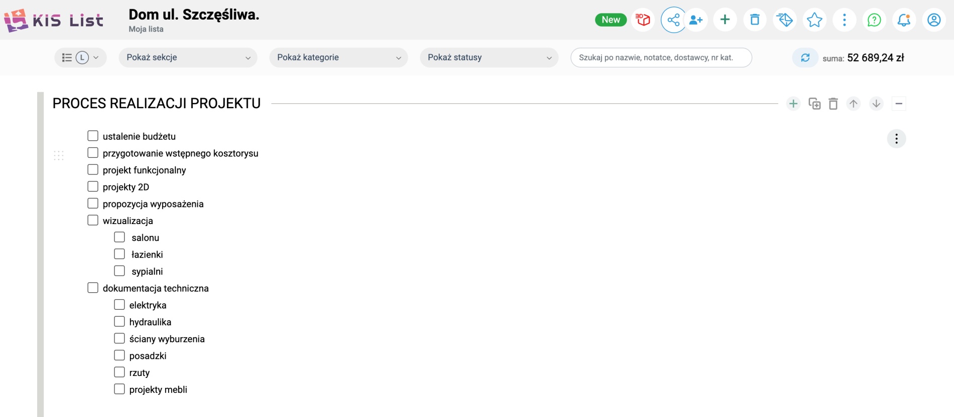 Każdy projekt, a tym samym kosztorys i lista zakupów, niosą ze sobą powtarzalne elementy. Niezależnie od tego, czy pracujesz nad domem, mieszkaniem, czy innym wnętrzem, zawsze znajdą się w nim takie przestrzenie jak łazienka, sypialnia, salon czy kuchnia, a w nich umywalka, łóżko, sofa, okap, gniazdka czy listwy przypodłogowe.