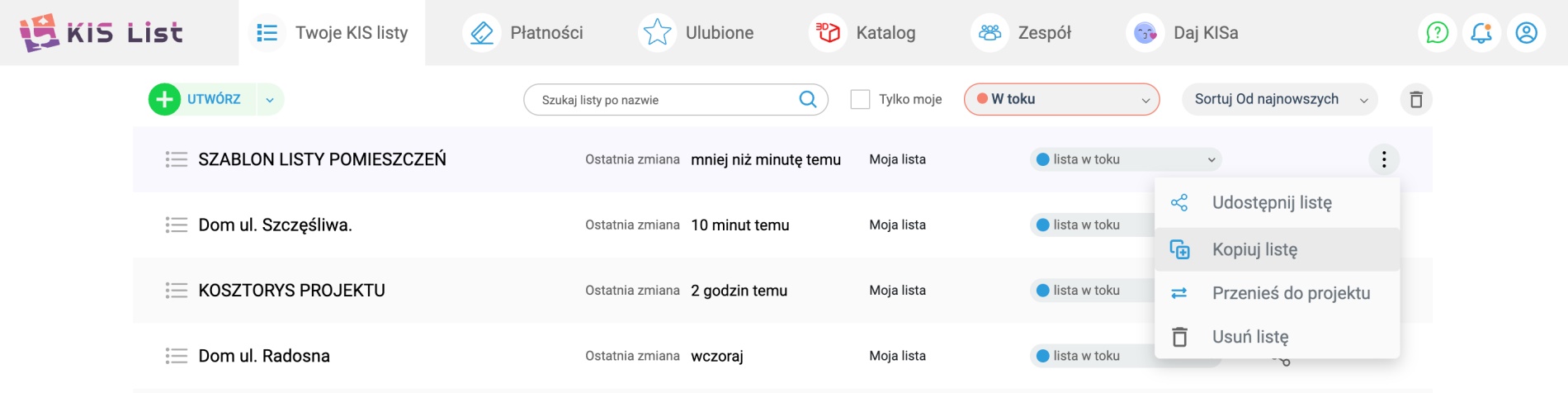 Rozpoczynając nowy projekt, wystarczy, że skopiujesz listę, która jest dla Ciebie szablonem i dostosujesz ją do potrzeb aktualnego zadania.