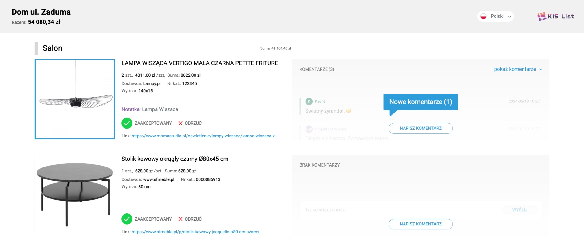 Potrzeba usprawnienia komunikacji z klientem i sprowadzenia jej do jednego miejsca/narzędzia była głównym motywem wprowadzenia funkcji dodawania komentarzy oraz akceptowania i odrzucania produktów na liście zakupów w KIS.
