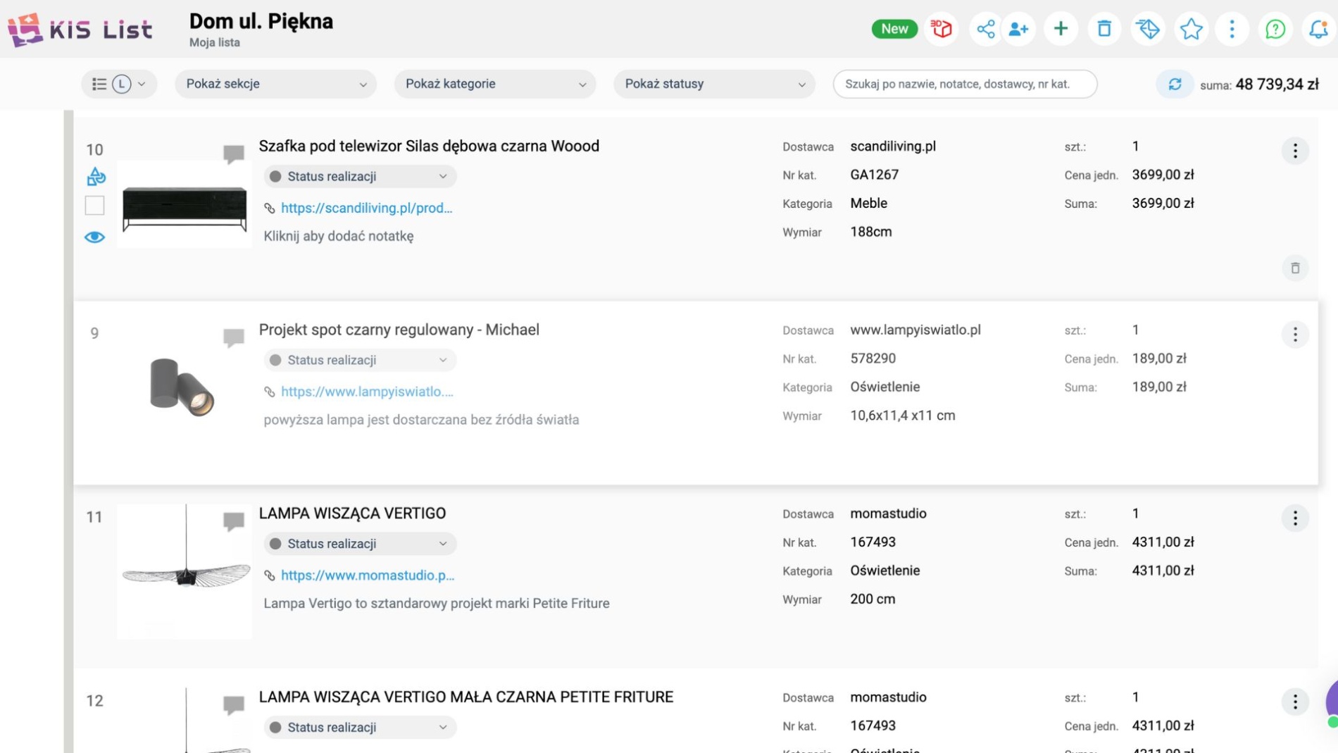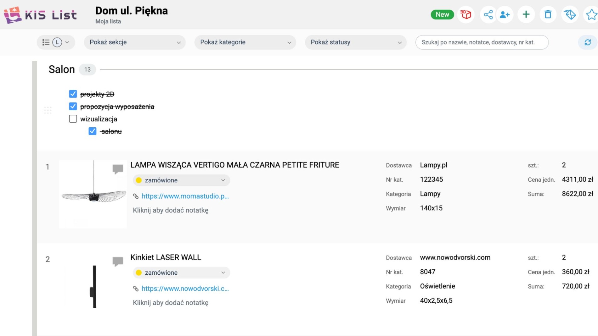 Na liście możesz też umieszczać własne notatki, współdzielić ją z zespołem, udostępniać w formie pdf i online klientowi. KIS List to wygodna lista zakupowa i program do kosztorysowania online w jednym, która uzupełnia program dla projektantów wnętrz i ułatwia życie. Tak po prostu :)