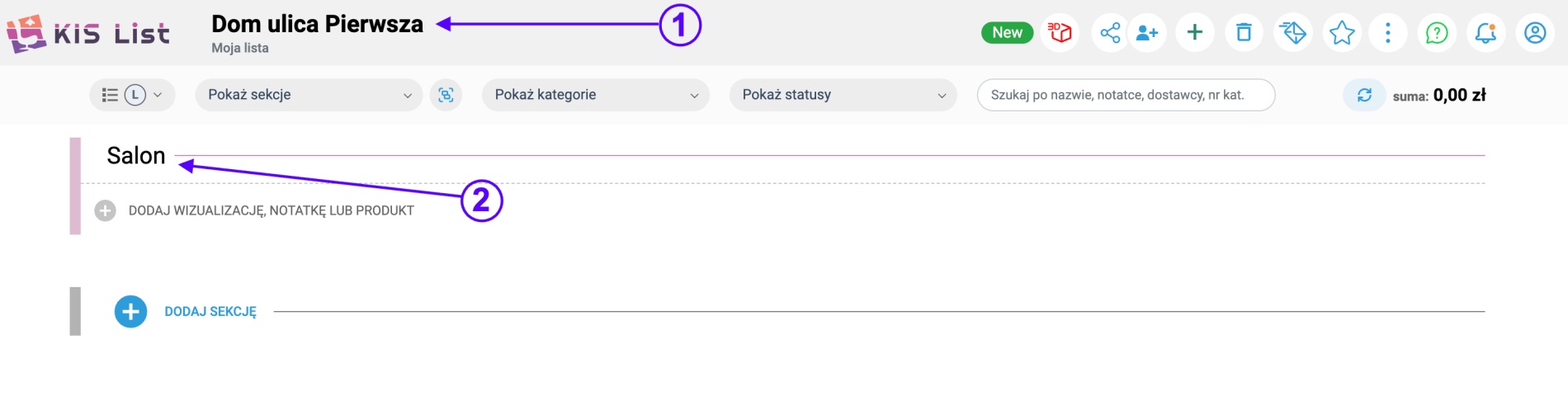 1. Nazwij swoją listę (1), a następnie utwórz sekcję (np. salon, kuchnia), tworząc strukturę listy (2)