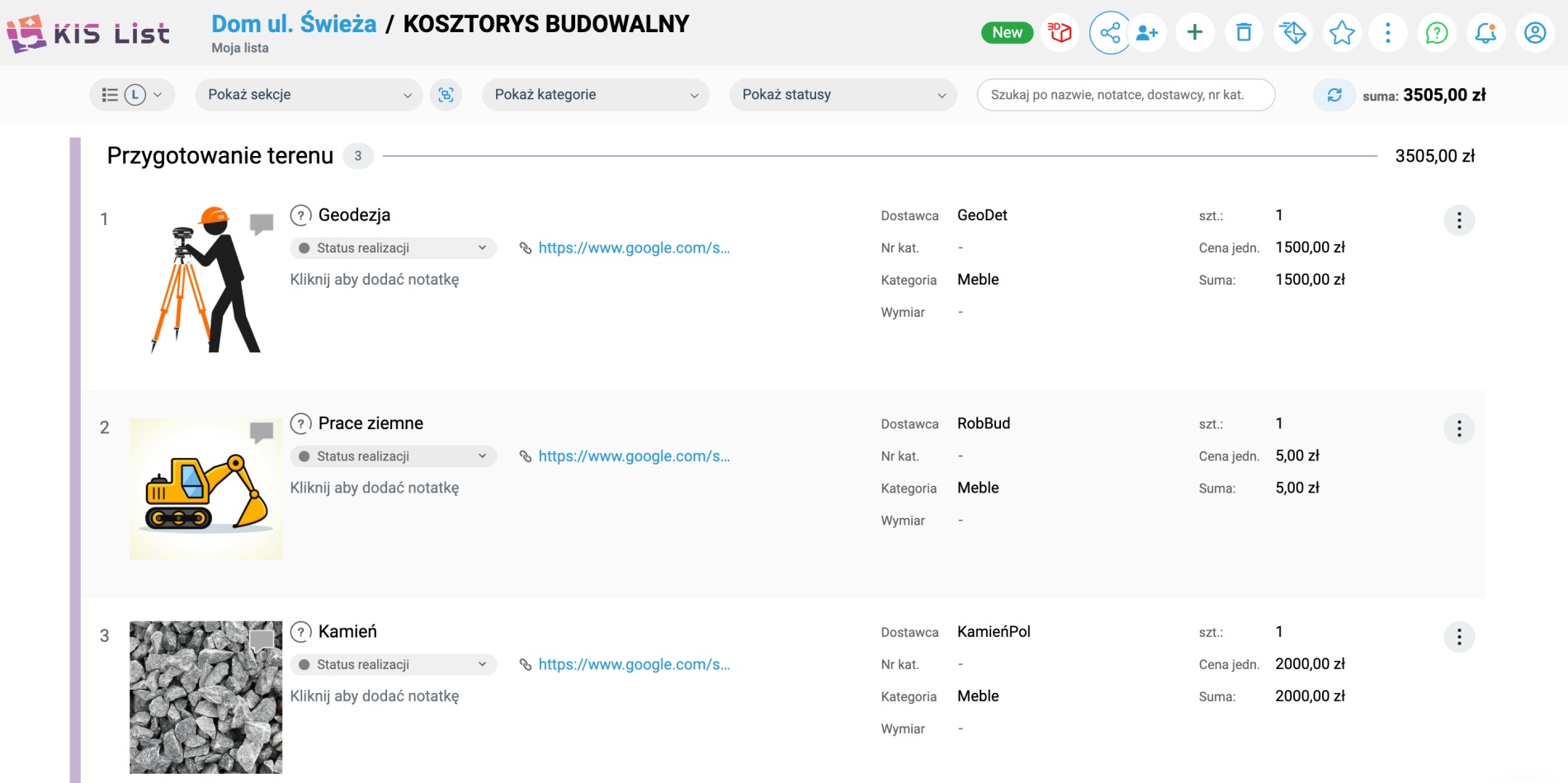 Z odsieczą przychodzi KIS List - aplikacja do robienia listy zakupów i program do kosztorysowania online , w którym błyskawicznie podliczymy wszystkie koszty inwestycji. Niezależnie od tego, czy interesuje nas stan zerowy, czy stan wykończeniowy, w KIS List przygotujemy każdy rodzaj kalkulacji: przedmiar robót albo pełen kosztorys budowlany, kosztorysy inwestorskie, kosztorys do kredytu hipotecznego dla banku, kosztorys ofertowy i powykonawczy.