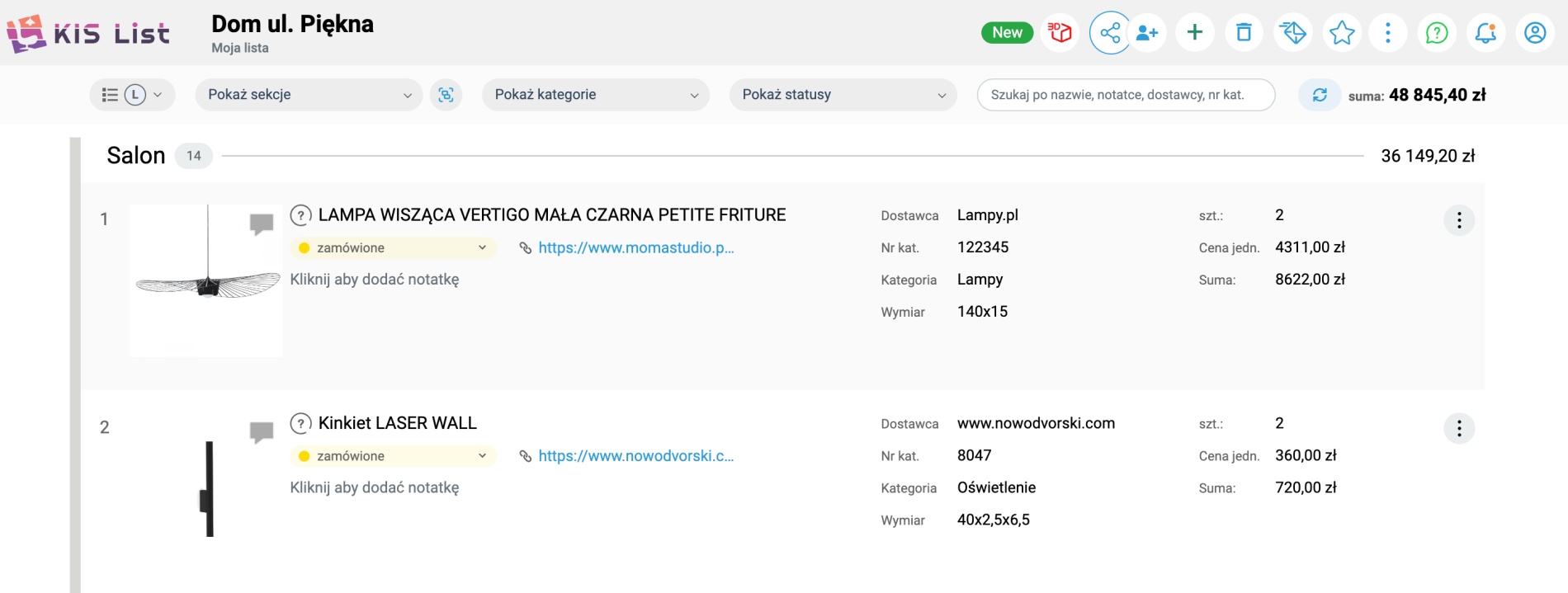 Kiedy lista zakupowa jest już wypełniona produktami, możemy ją dowolnie edytować; przenosić produkty, oznaczać jako opcje, ukrywać i wprowadzać alternatywne pozycje. To prawdziwe centrum dowodzenia nad projektem i budżetem, które dzięki pełnej kontroli nad wszystkimi elementami równocześnie ułatwia obniżenie wydatków.