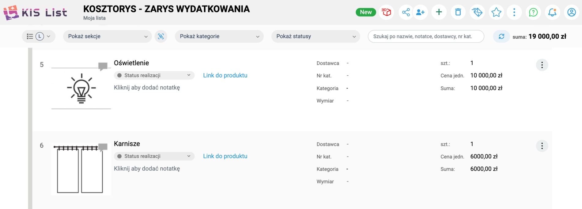A co z kosztorysem? Ten w KIS List powstaje samoistnie - aplikacja automatycznie tworzy całkowity koszt wykończenia mieszkania, podsumowując wszystkie produkty dodane do listy. Oczywiście, oprócz "odgórnego" obliczenia mamy możliwość umieszczenia w zestawieniu innych pozycji i dodatkowych kosztów.