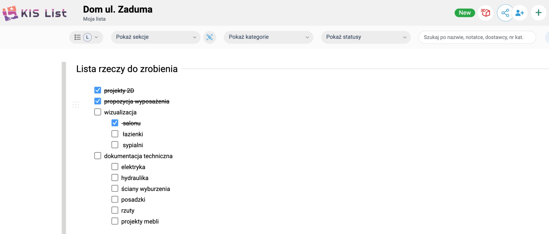 Niezależnie od tego, czy Twój projekt to pojedyncza lista zakupów, czy duży projekt kilku mieszkań, KIS List pomaga Ci uchwycić całość działań w przejrzyste listy TODO.